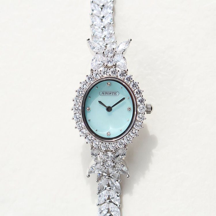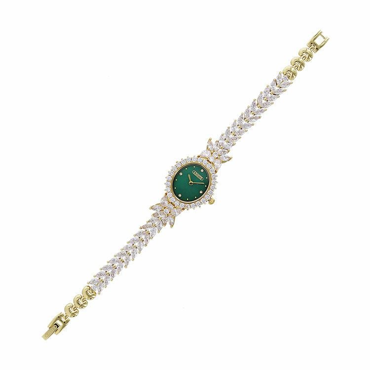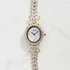 まるでジュエリーのように華やかなブレスレット時計。品よく視認性も良いやや小ぶりなオーバルフェイス。ドットインデックスで時刻も見やすく、3.6.9.12部分にはポイントストーンがあしらわれています。
