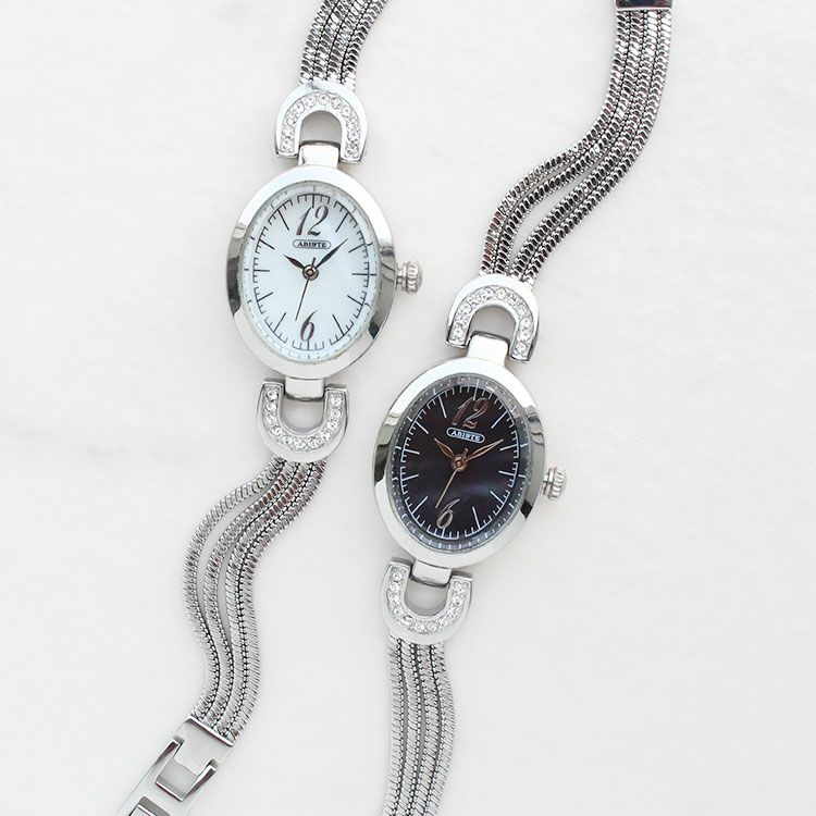 アクセサリー感覚でつけられる華奢なチェーンのブレスレット腕時計。楕円形のフェイスはクラシカルかつ品のある印象で、幅の割に文字盤が広いので視認性も◎。時刻がわかりやすく、簡易コマでご自身での長さ調節が容易なので、ギフトにもオススメです。