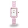 セラミック製の時計。金属製よりも軽く、ミルキーな色合いも可愛いので、ブレスレット感覚で着けられます。エレガントなデザインと可愛いカラーのバランスが◎。カジュアルスタイルに大人の女性らしさをプラスします。