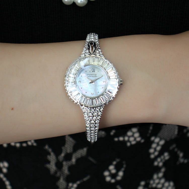 着脱が簡単なバングルウォッチ。キラキラ好きには堪らないフェイスまわりとバングル全体に施されているクリスタルガラスがラグジュアリーな雰囲気を演出しています。