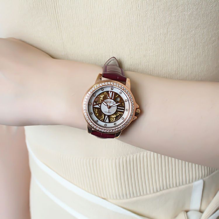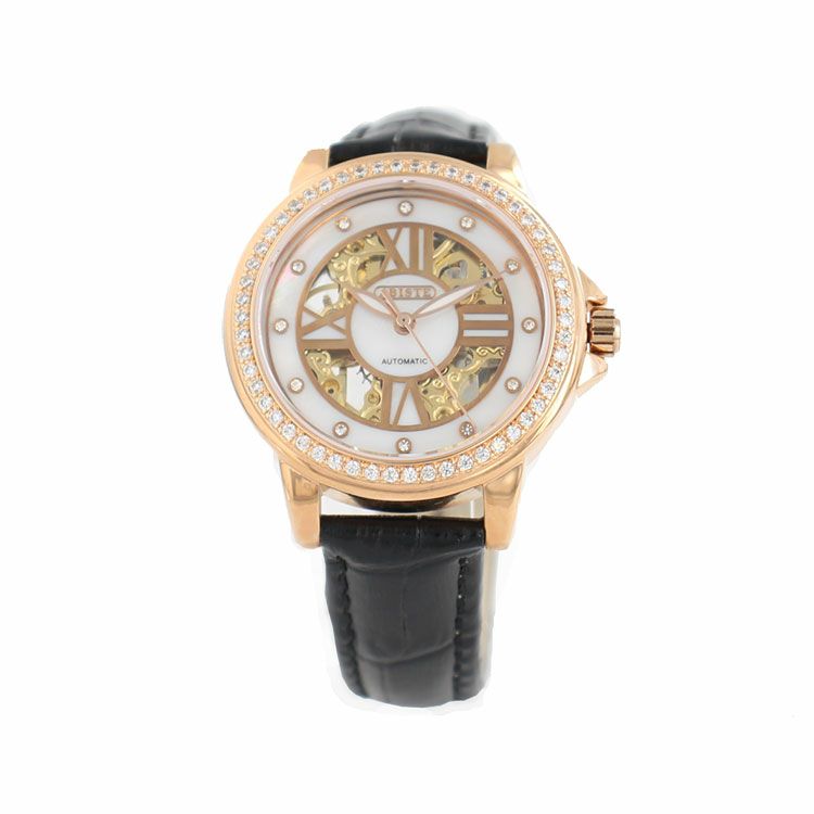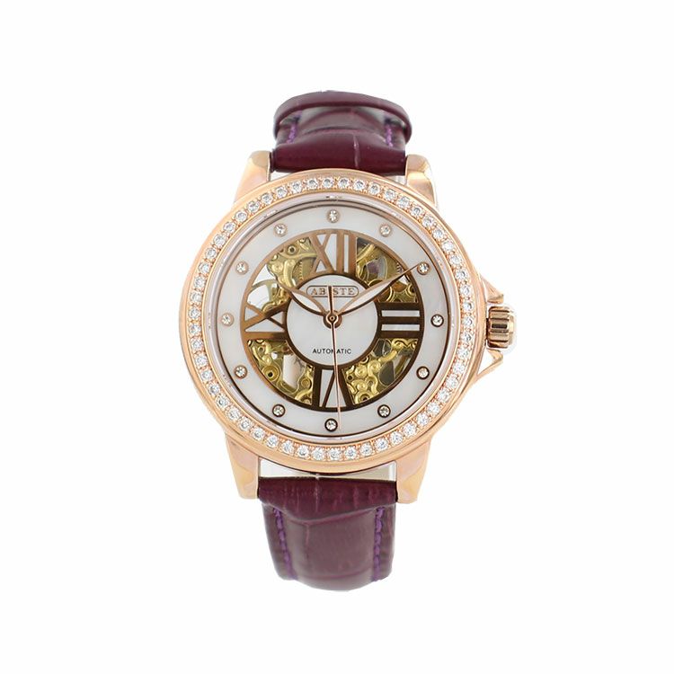 フェイスの中央からはその繊細な技術を見ることができる機械式タイプ。フェイス周りにキュービックジルコニアがあしらわられ高級感を演出しています。