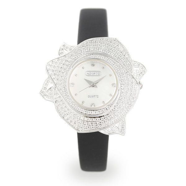 バラの花と4枚の葉をイメージしたフェイスにキュービックジルコニアを贅沢に施し、上品で可憐なデザインの腕時計。