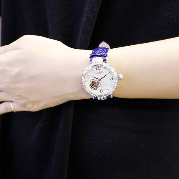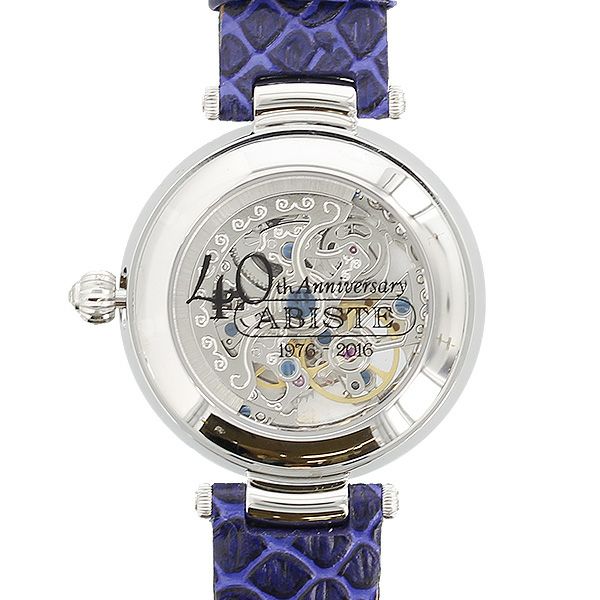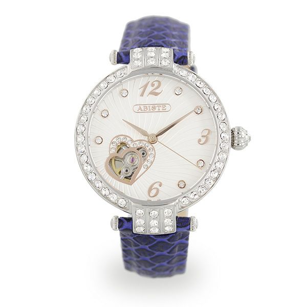 アビステならではのこだわりの自動巻き時計は、クリスタルガラスを贅沢にあしらったフェイス、フェイス内側にあるハートモチーフからは内部がチラリと覗き、スケルトンになった裏側からは内部全体を見ていただくことができます。