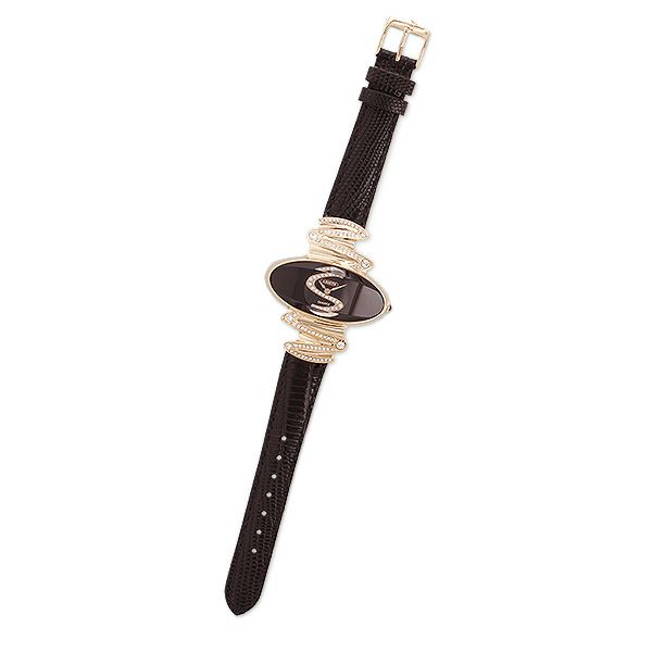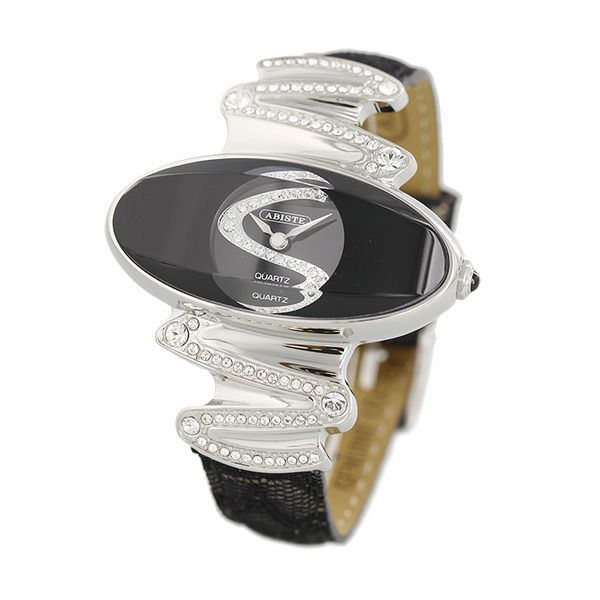 横長のオーバルフェイスが特徴的なベルト時計。フェイスの上部からフェイスの中、そしてフェイスの下部へと続くクリスタルガラスの曲線が美しいこだわりの腕時計です。