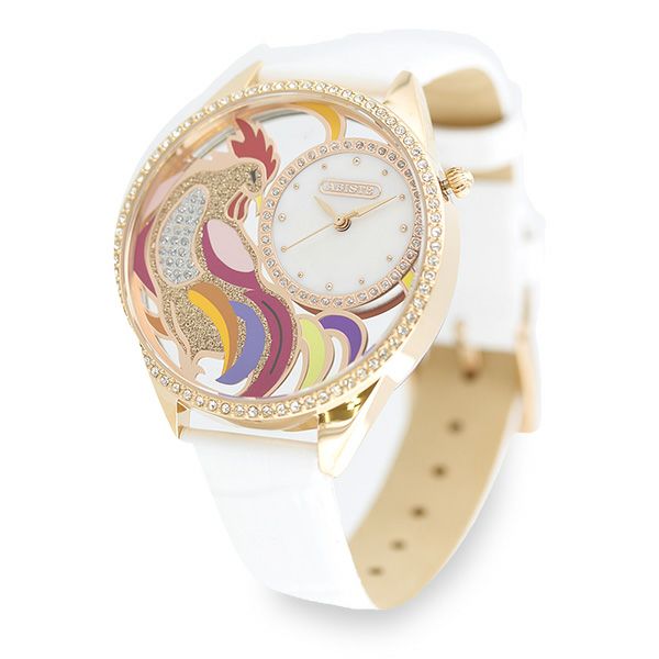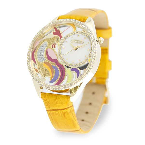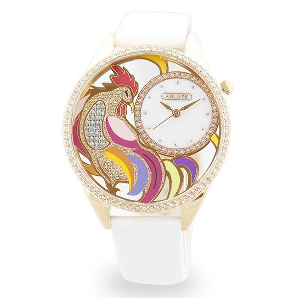 透かしになったフェイスにカラフルなルースターがデザインされた腕時計。