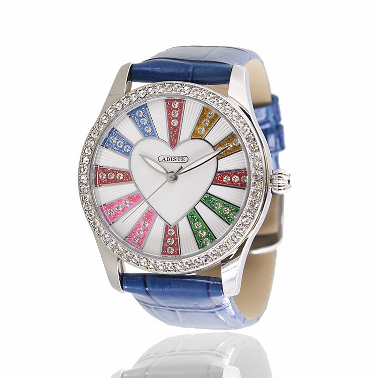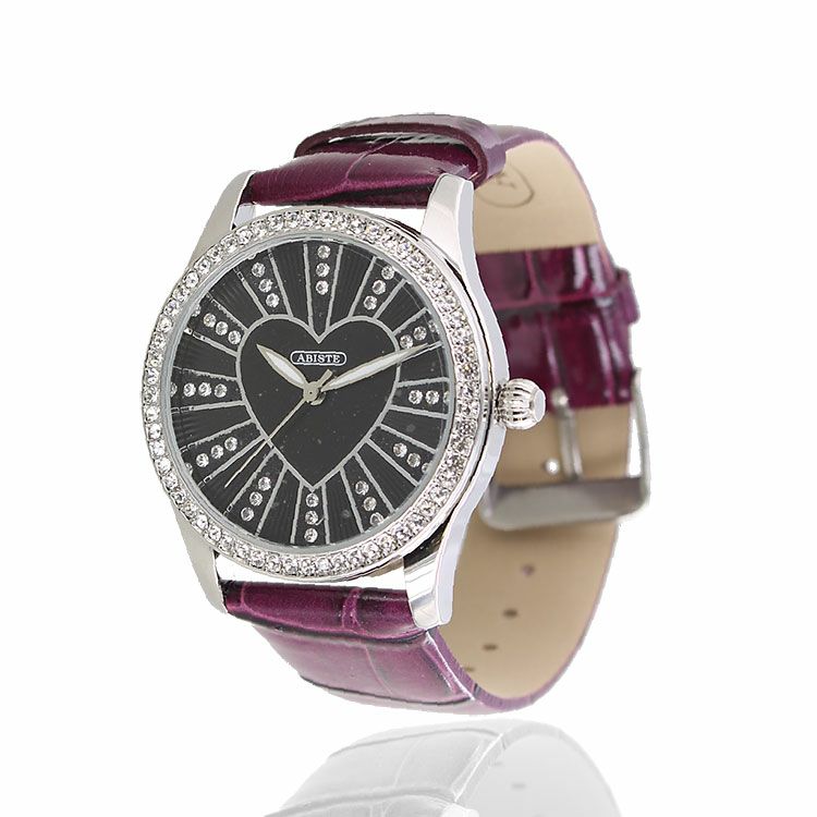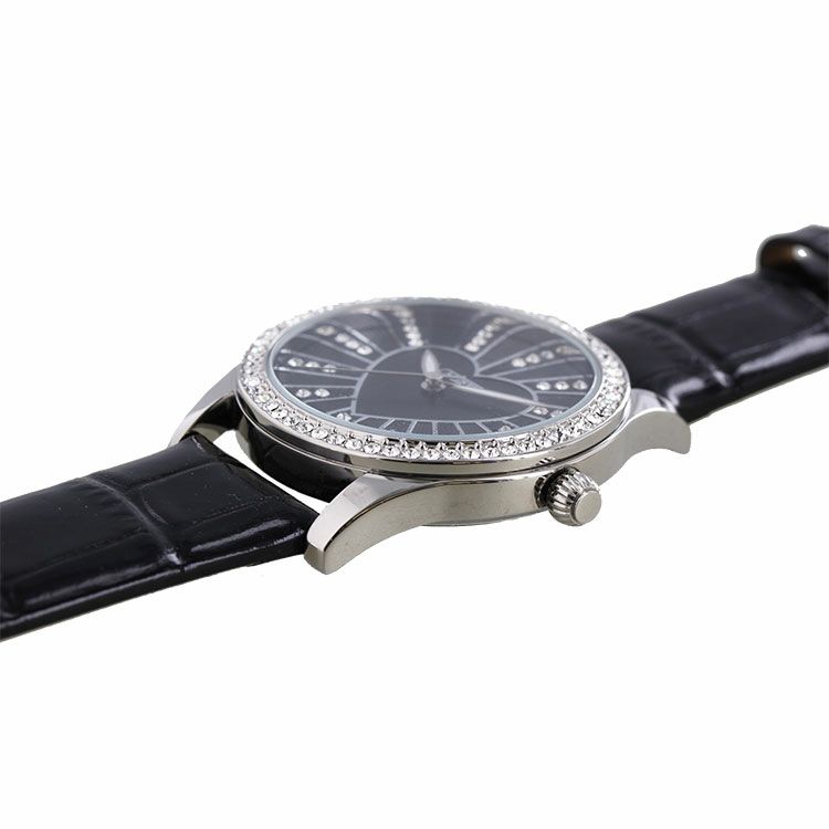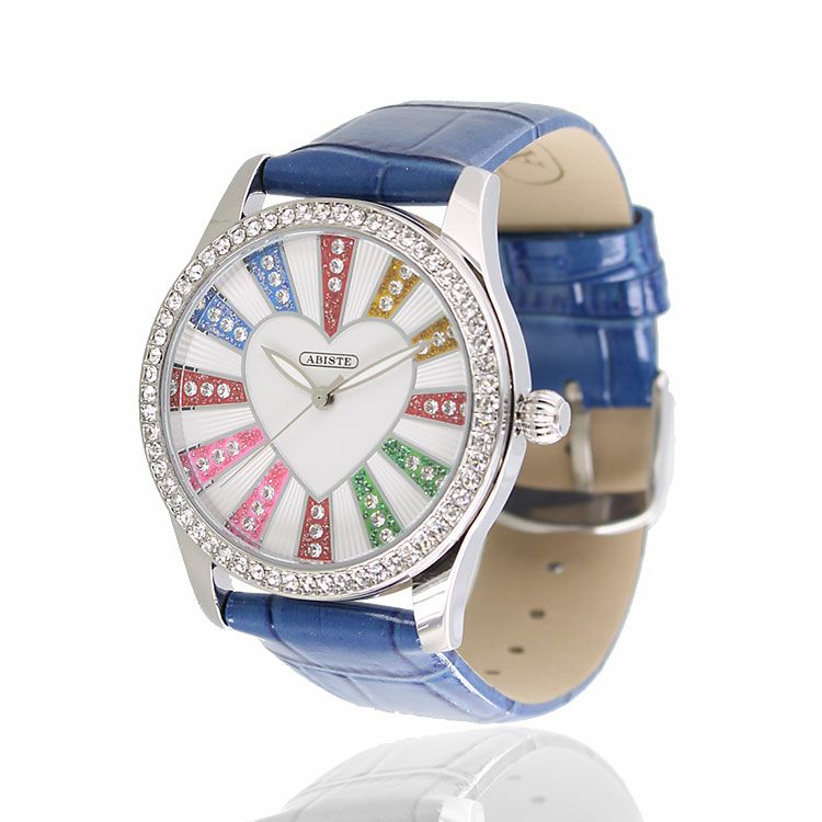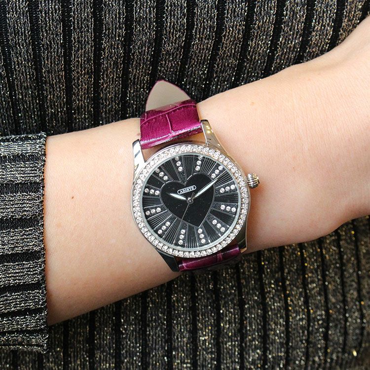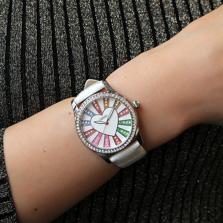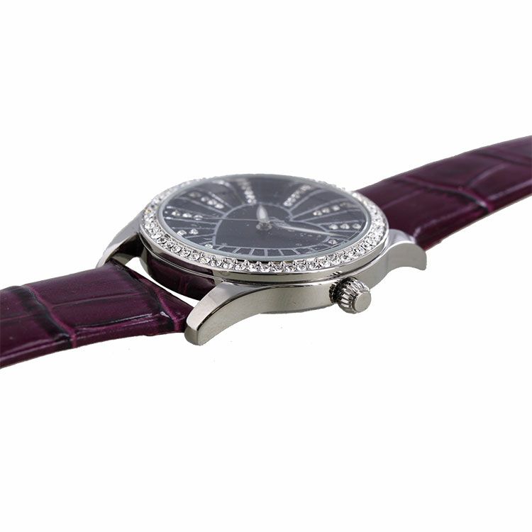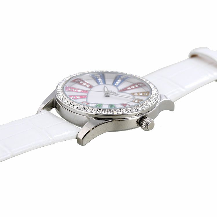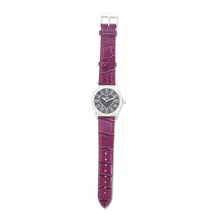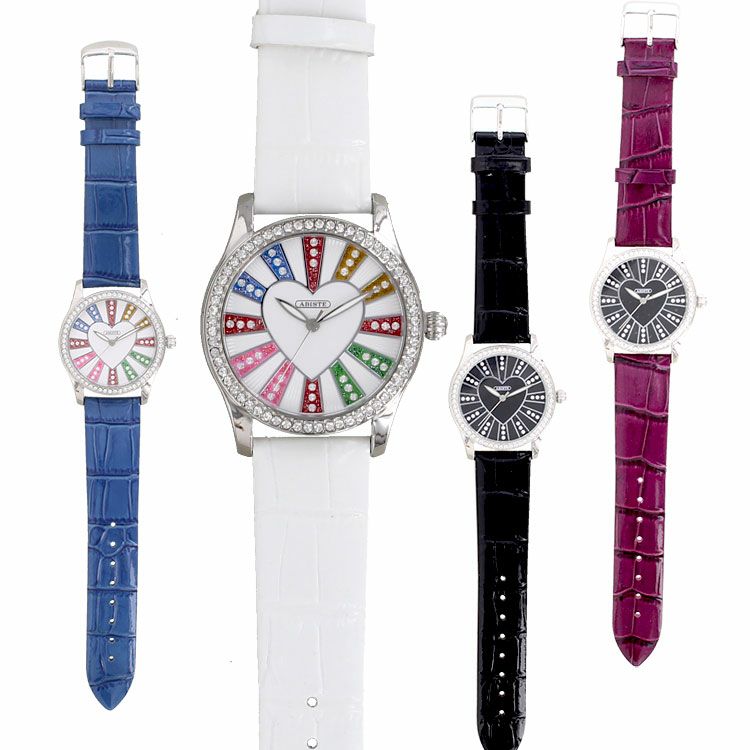 ベゼルをクリスタルガラスで囲んだキュートなハートモチーフベルト腕時計。文字盤もクリスタルガラスをあしらったキュートでラグジュアリーなデザインです。ホワイトとブルーはカラフルに、パープルとブラックはシックな雰囲気を演出。革ベルトがしっくり手に馴染んで使いやすい腕時計です。