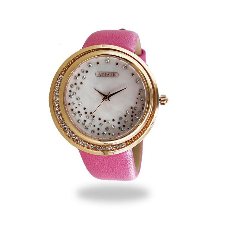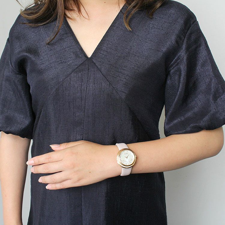 文字盤にチェコストーンがちりばめられたラウンドフェイス腕時計。ケースにも文字盤と同じようなイメージで、左下から右上にかけてクリスタルガラスが華やかにしきつめられ、洗練された大人かわいさを備えたデザインです。普段使いはもちろん、オフィス使い、パーティーシーン、プレゼントにもおすすめです。