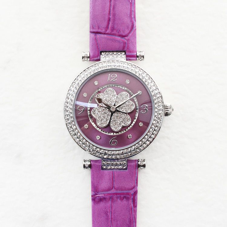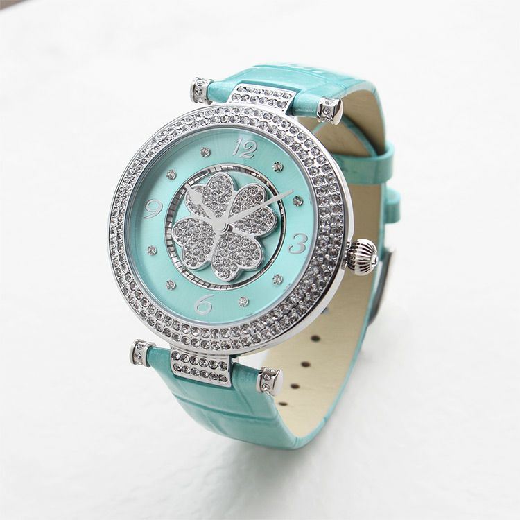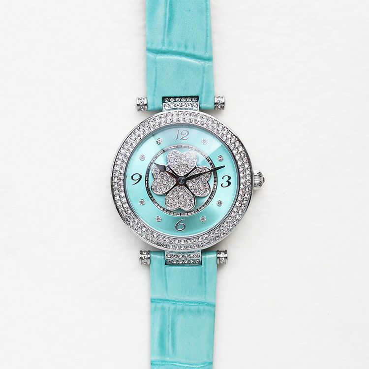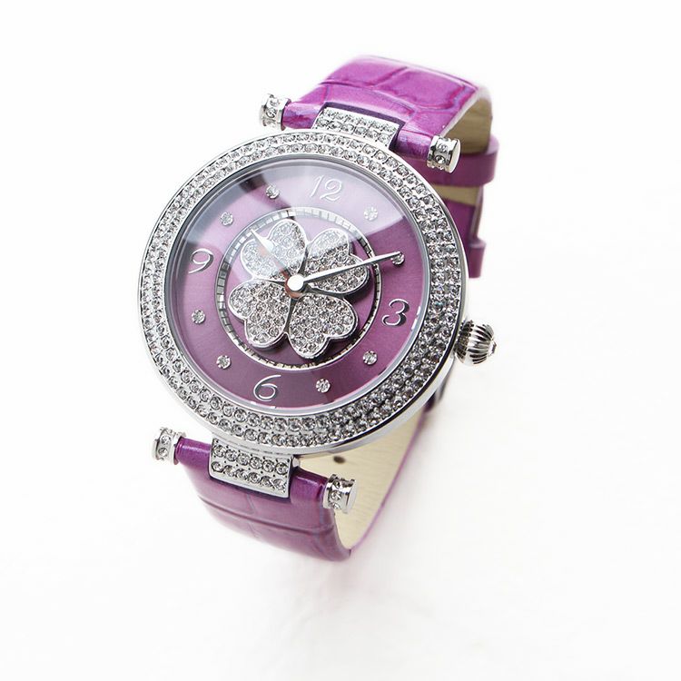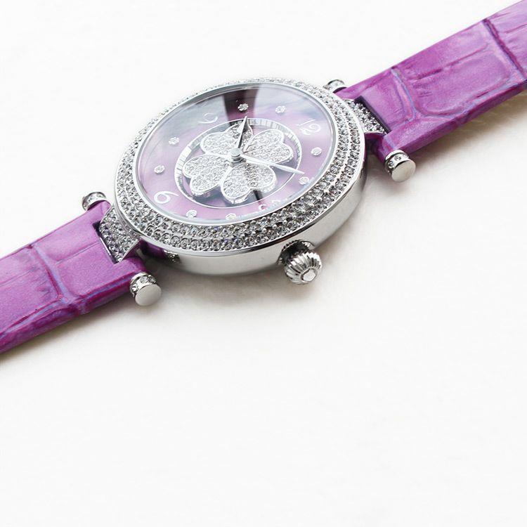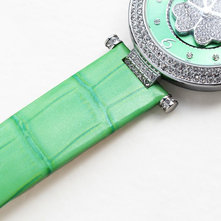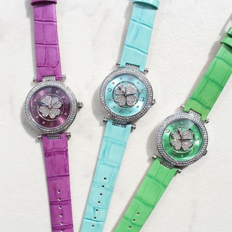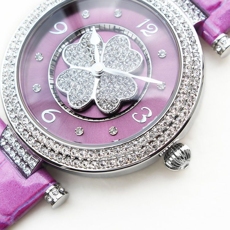 動くたびにクローバーモチーフがクルクルと回転する腕時計。微細なラメ感のある革ベルトは、防水加工を施した牛革を使用しています。オーストリア製クリスタルガラスを随所にふんだんに用い、まるでジュエリーウォッチさながらの華やかさに。
