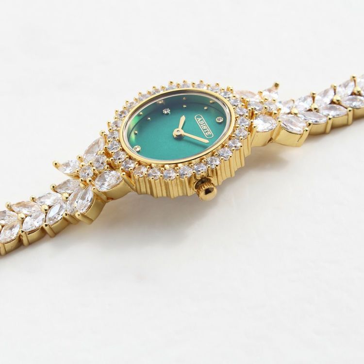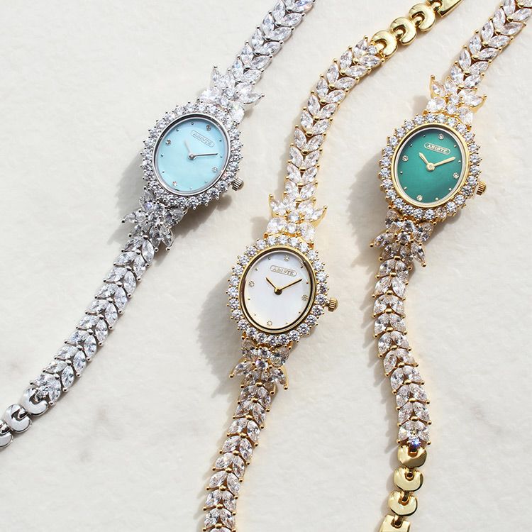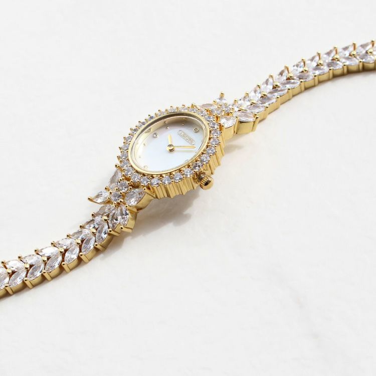 まるでジュエリーのように華やかなブレスレット時計。品よく視認性も良いやや小ぶりなオーバルフェイス。ドットインデックスで時刻も見やすく、3.6.9.12部分にはポイントストーンがあしらわれています。
