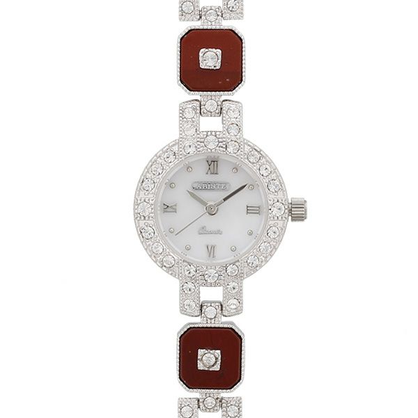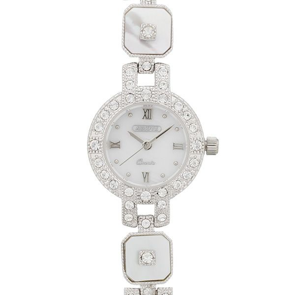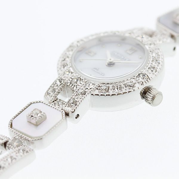 白蝶貝の文字盤に美しく輝くクリスタルガラスエレメンツ。ポイントにあしらわれたレインボージャスパーが個性的に腕元を演出するブレスレット時計です。