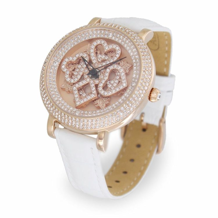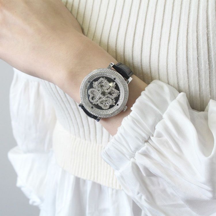 ベゼルやリューズまでクリスタルガラスを贅沢にあしらったラグジュアリーなベルト時計です。