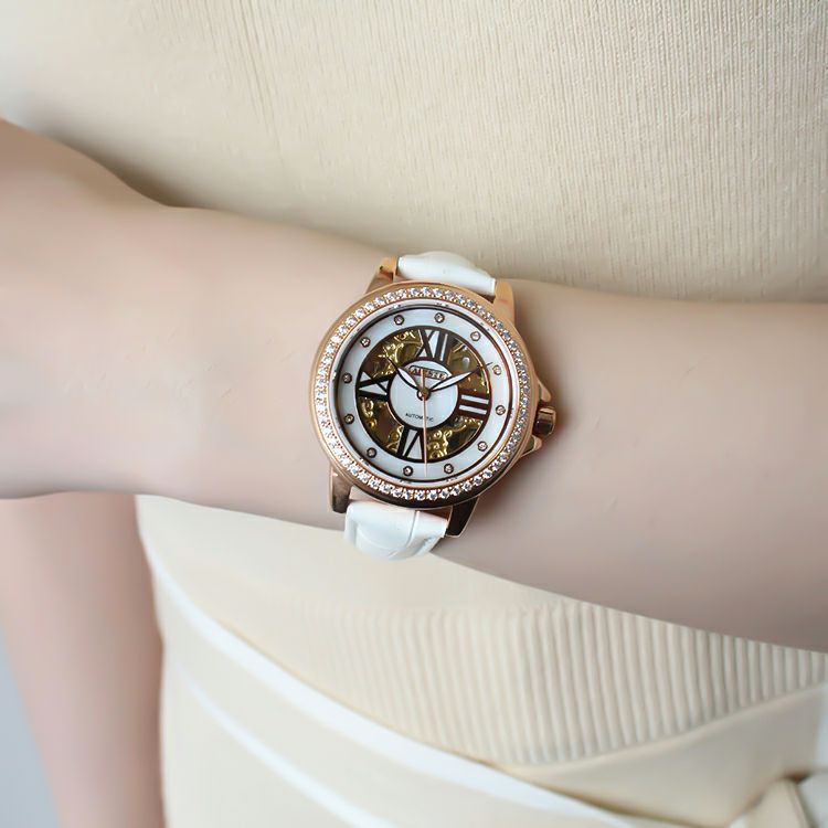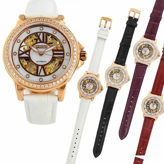 フェイスの中央からはその繊細な技術を見ることができる機械式タイプ。フェイス周りにキュービックジルコニアがあしらわられ高級感を演出しています。