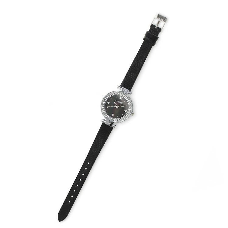 ブラックの革ベルトにラウンド型クリスタルのケースが映える腕時計。