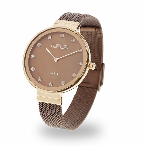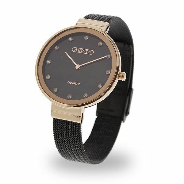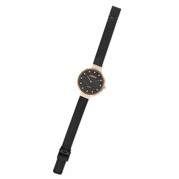 スッキリとした大きなフェイスと、文字盤にクリスタルガラスがあしらわれたシンプルなデザインの腕時計。世代や流行にとらわれず、長く愛せる洗練されたデザインの時計です。 スライド式留め具でご自身でサイズ調整が可能なので、コマ詰め不要でギフトにも最適☆