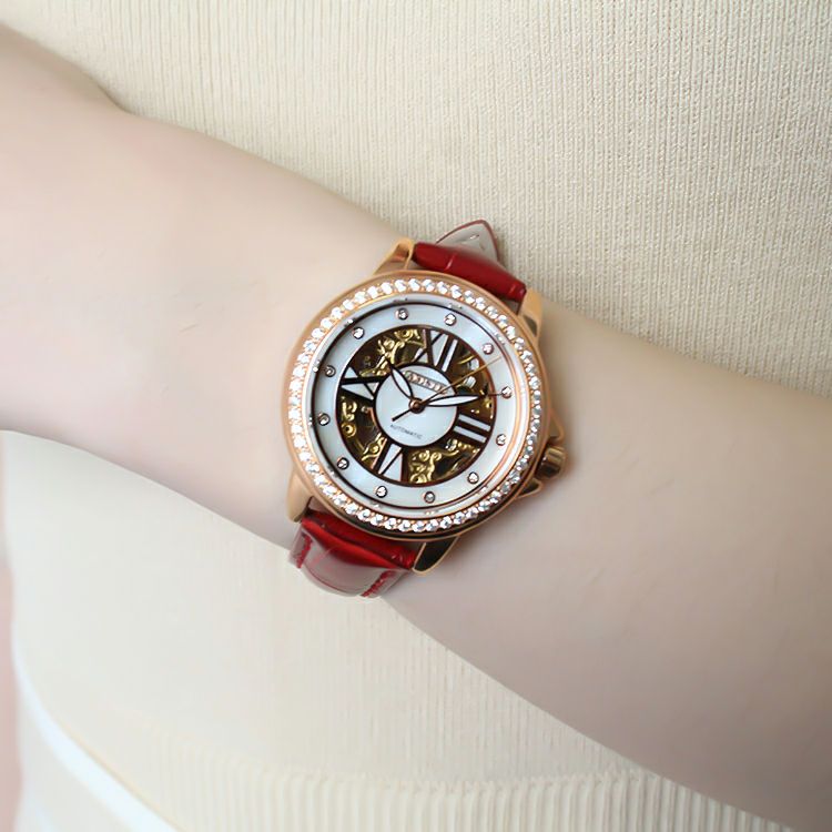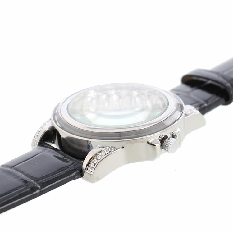 ラウンドフェイススケルトンキュービックジルコニア革ベルト腕時計/9160017