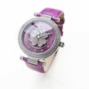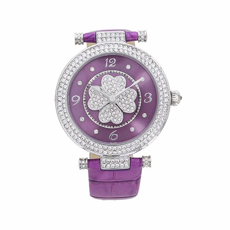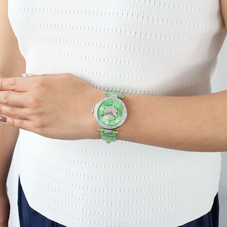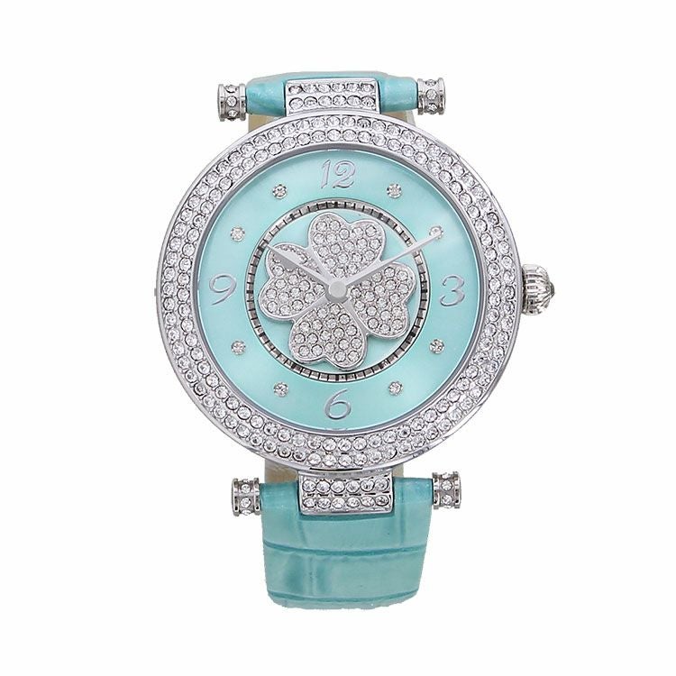 動くたびにクローバーモチーフがクルクルと回転する腕時計。微細なラメ感のある革ベルトは、防水加工を施した牛革を使用しています。オーストリア製クリスタルガラスを随所にふんだんに用い、まるでジュエリーウォッチさながらの華やかさに。