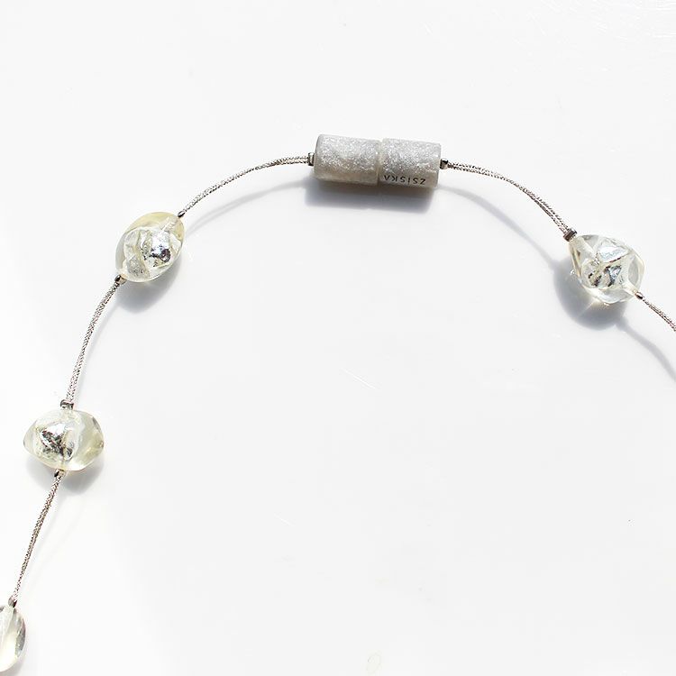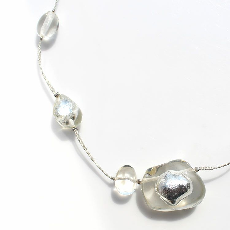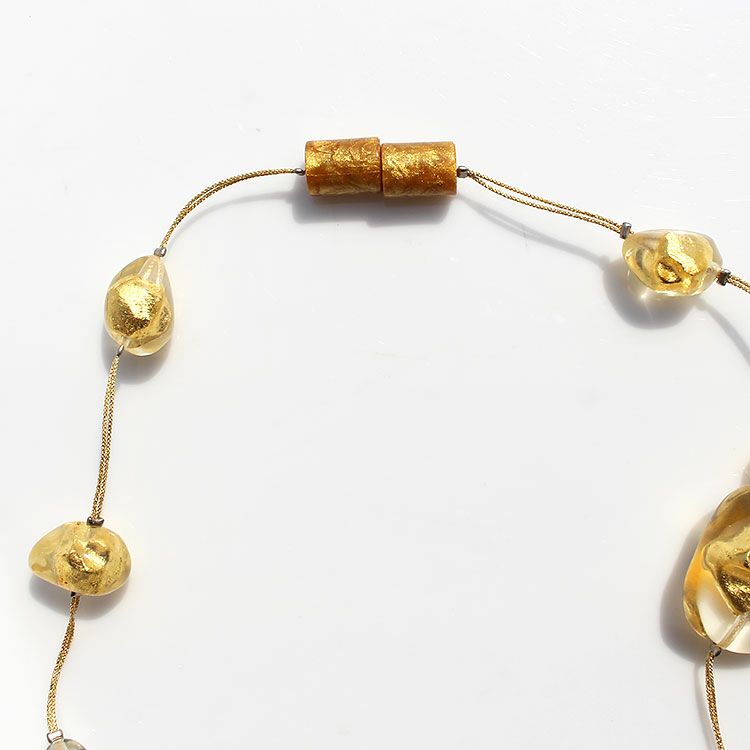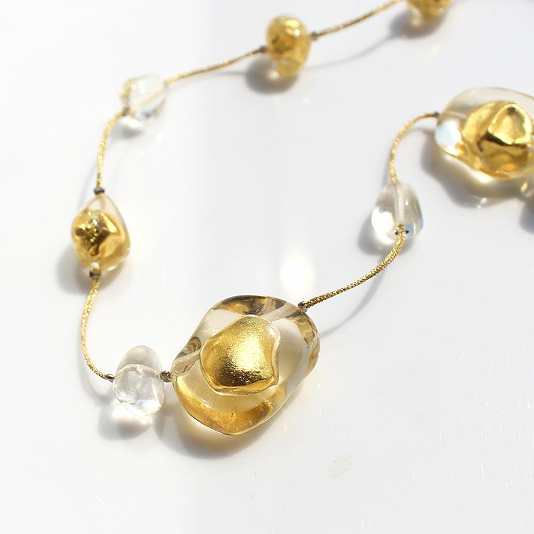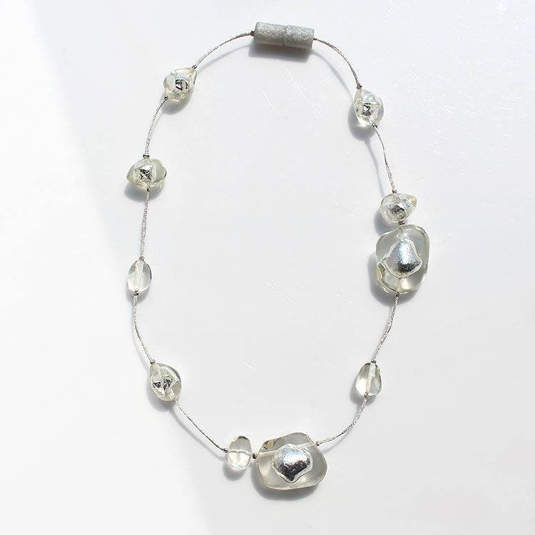 アートのような変形したフォルムがニュアンスのあるレジンショートネックレス。キラキラと光を反射するレジンに銀箔、金箔がアクセントになって、ラグジュアリーで、モードな雰囲気を印象付けています。どの角度から見てもこなれ感あるデザインは、デイリー使いはもちろん、パーティーシーンにもおすすめです。