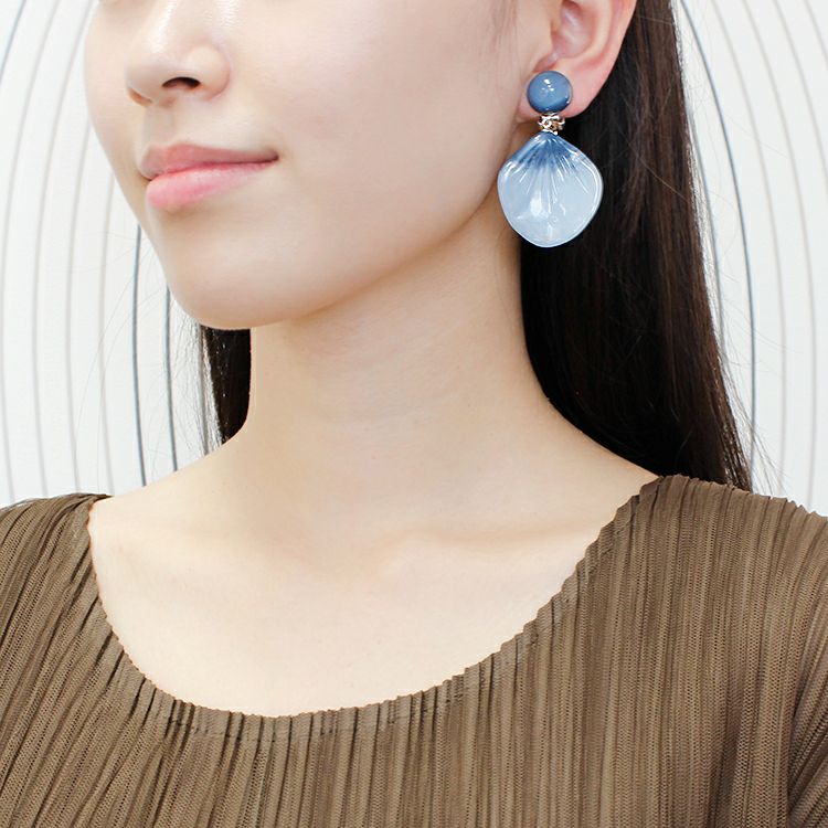 ブルームは繊細な花びらがモチーフ。彫刻をほどこしたかのような薄いパーツは、身に付けると非常に軽く、しかし同時にダイナミックな動きがあります。見方によっては、シェルパーツのようにも見えるため、少しハワイアンな印象にも。抑えた色味のため、秋口まで長くお使いいただけます。