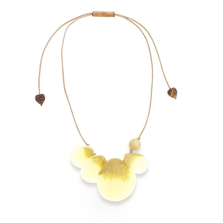 ブルームは繊細な花びらがモチーフ。彫刻をほどこしたかのような薄いパーツは、身に付けると非常に軽く、しかし同時にダイナミックな動きがあります。見方によっては、シェルパーツのようにも見えるため、少しハワイアンな印象にも。抑えた色味のため、秋口まで長くお使いいただけます。