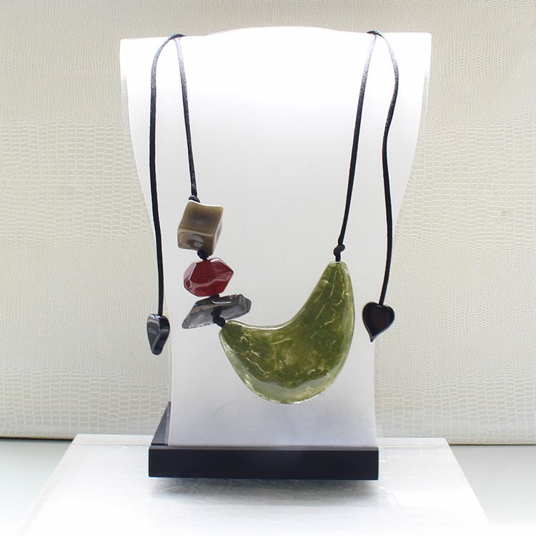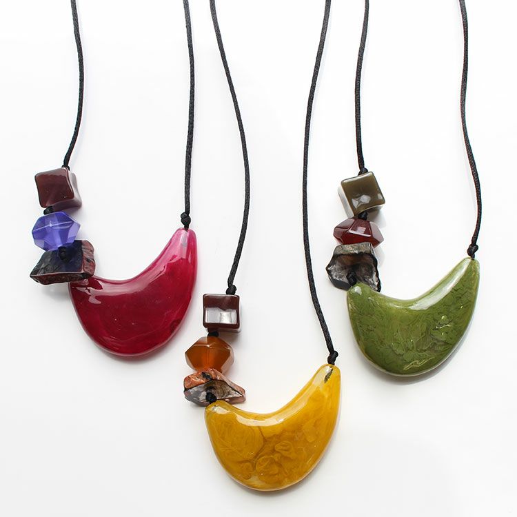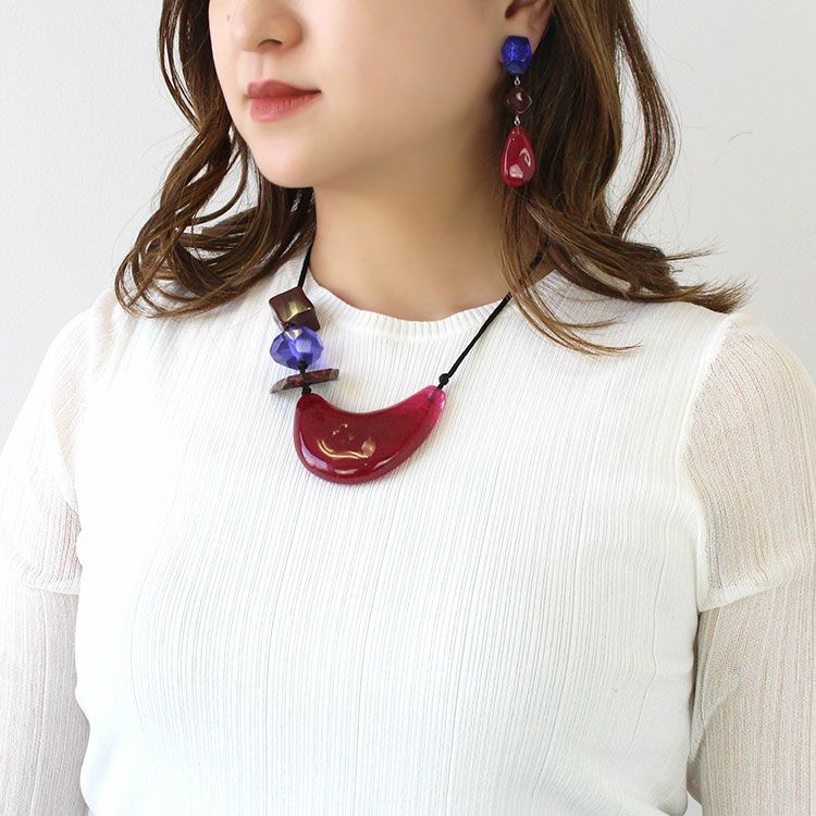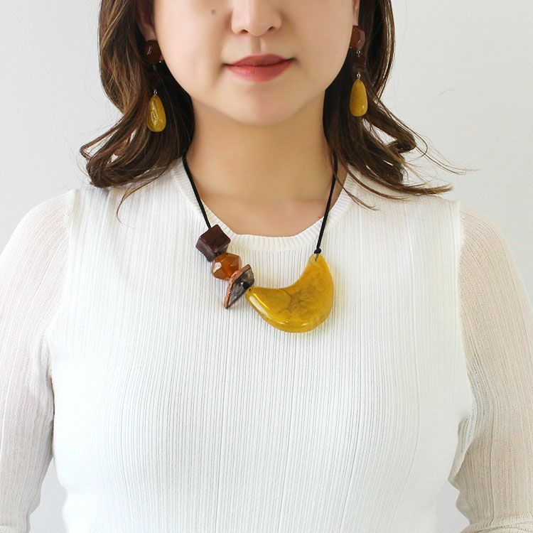 上質な樹脂、ポリエステルレジンの特性を活かし、ガラスのような質感を再現しつつも、軽くてつけやすいことで人気を博しています。肌に触れる部分に金属を使用していないため、アレルギーの方でも安心してお使いいただけます。