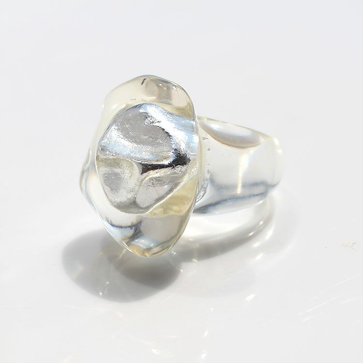 アートのような変形したフォルムがニュアンスのあるレジンリング。キラキラと光を反射するレジンに銀箔、金箔がアクセントになって、ラグジュアリーで、モードな雰囲気を印象付けています。どの角度から見てもこなれ感あるデザインは、デイリー使いはもちろん、パーティーシーンにもおすすめです。
