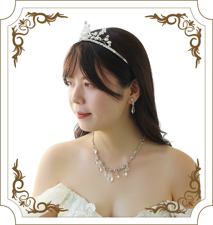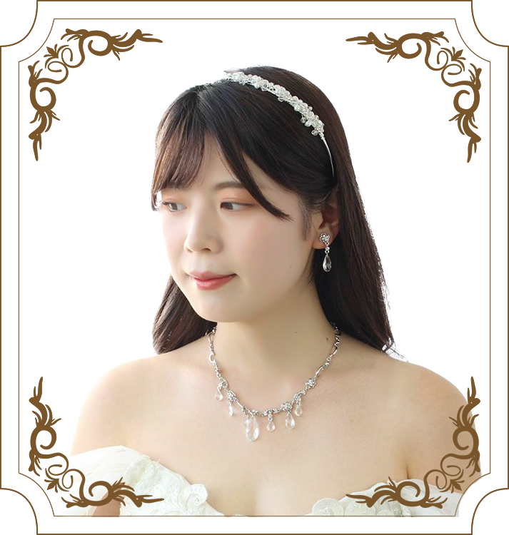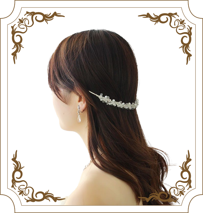 頭に沿うように着けられるカチューシャティアラは、ヘアスタイルを選ばずアレンジしやすいのが特長。柄の部分が調整できるので、頭の大きさや形を気にせずお選びいただけます。横のラインを強調してくれるので、面長の方にもおすすめです。