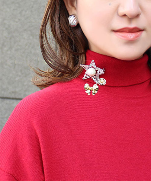 遊び心あふれる複数使いはブローチ上級者のテクニック。テーマやカラーを決めて大小のブローチをミックスするとバランスが良くなります。難易度が高いアレンジではありますが、付け方の基本さえ押さえておけば、あとは「気分が上がるお気に入り」を選べばOK。あまり難しく考えすぎず自由に楽しむことが一番のポイントです!