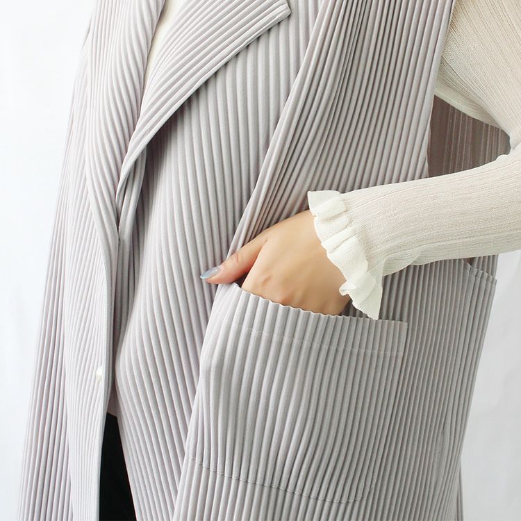 プリーツウェアは凹凸があるので肌表面に空気の通り道ができ、暑い季節にもとてもおすすめ。ゆったりとした身頃のシルエットも、風を纏って涼しく過ごすのに役立ちます。