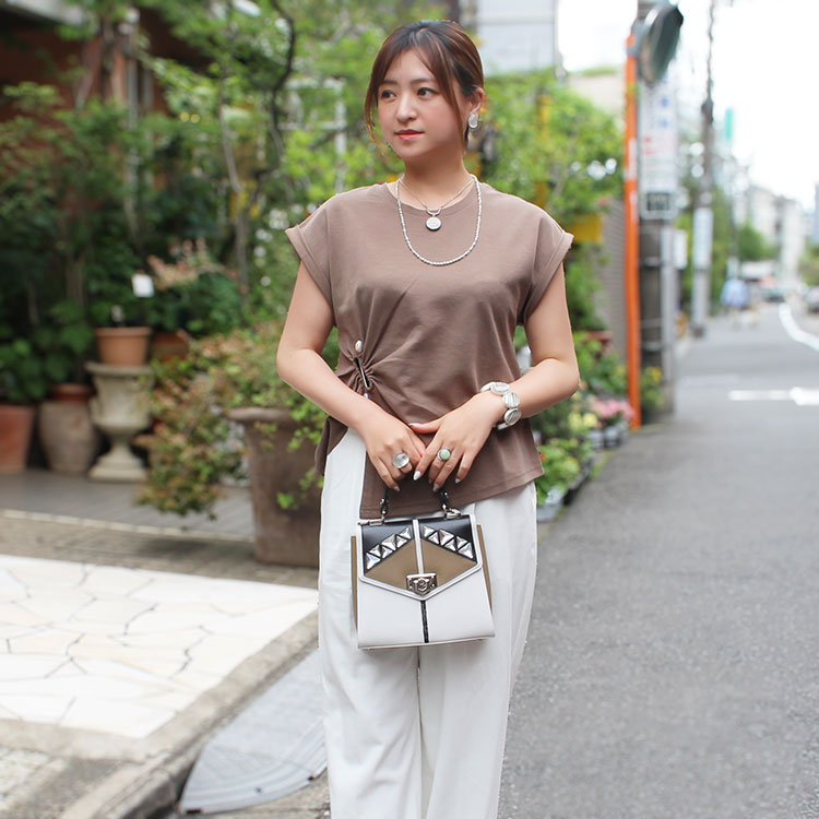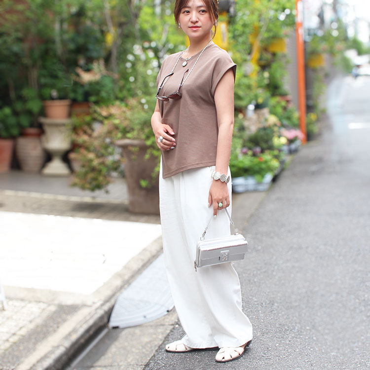 今回コーディネートのメインアイテムに選んだアビステの今季の新作ウエストマークTシャツは、袖の折り返しやウエストのアクセントでベーシックながらも一枚で簡単に着映えるデザイン。明るく見えるシルバーのアクセサリーやクリーンなホワイトのワイドパンツを合わせ、楽ちんなのにきちんと華やかな印象になる、大人のカジュアルコーディネートに仕上げました。