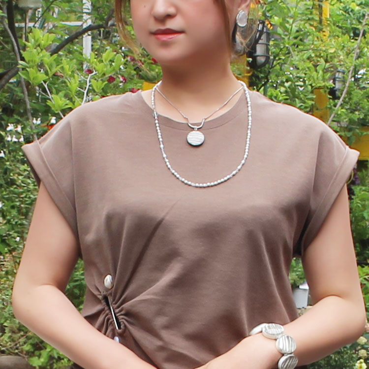 波模様が涼しげなシルバー地金のショートメタルネックレスに、小粒パールのネックレスをレイヤード。ホワイトのイヤリングにはMOP(マザーオブパール/真珠母貝)が用いられています。