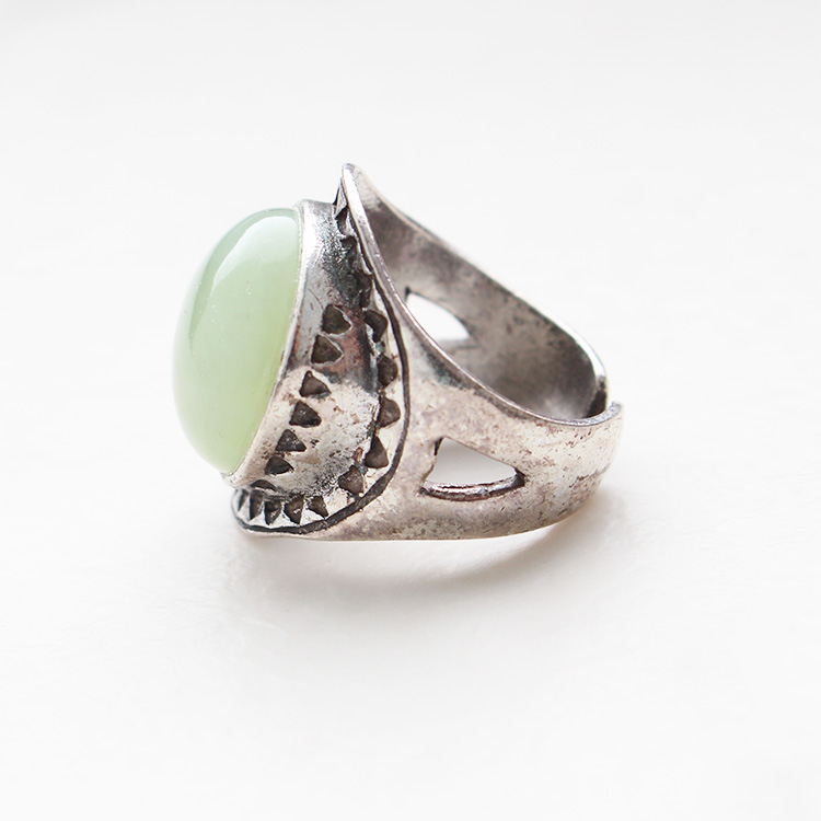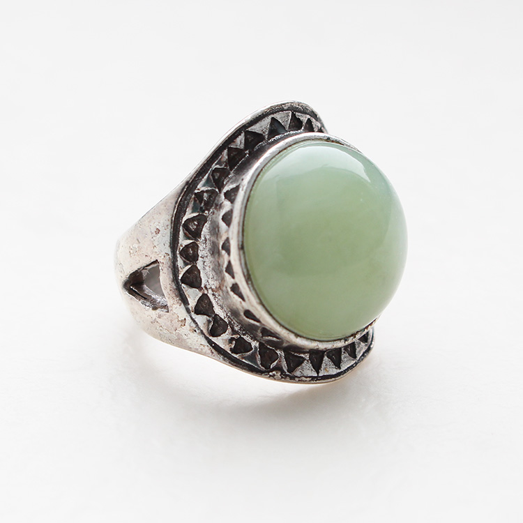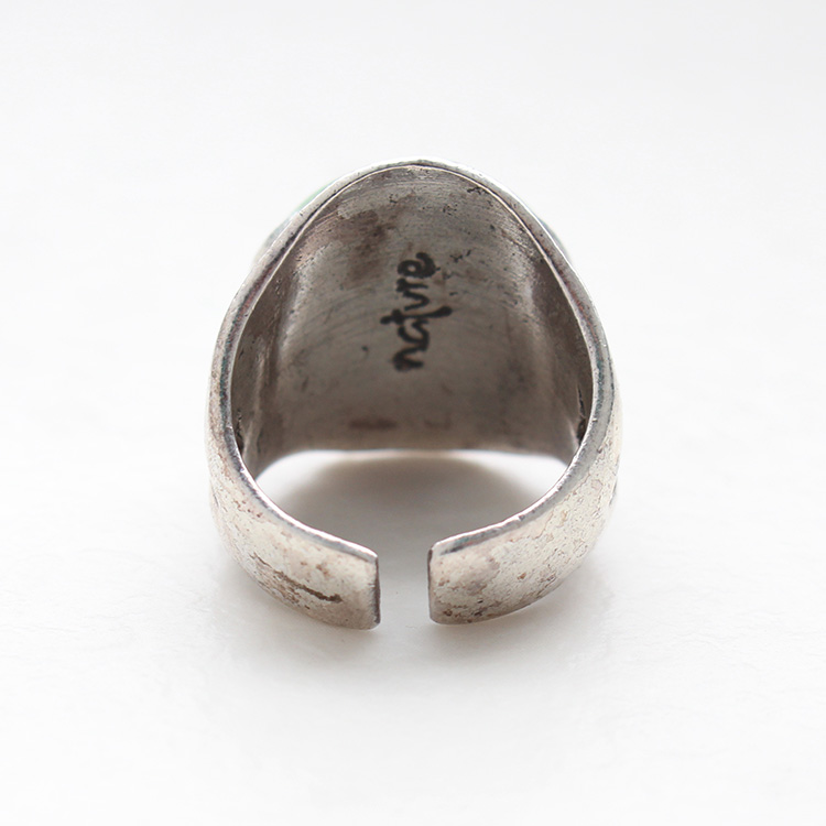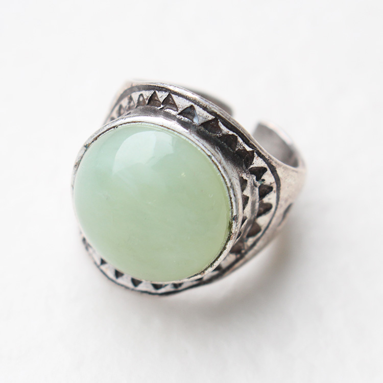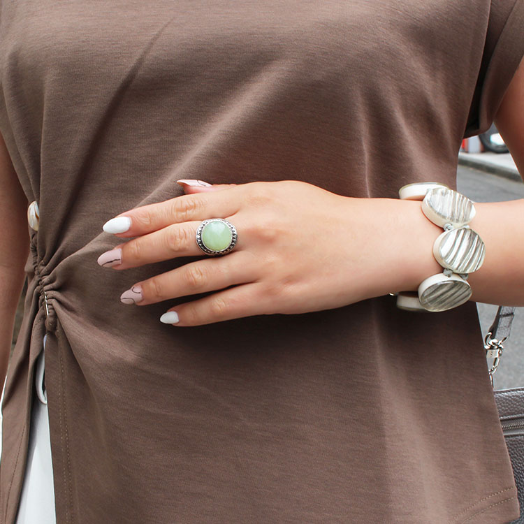 リングのグリーンを差し色に。Tシャツのブラウンとアースカラーでリンクしているので馴染みつつ華やぎをプラスしてくれます。レジンのゴムブレスレットはカラーと波模様でリンク。