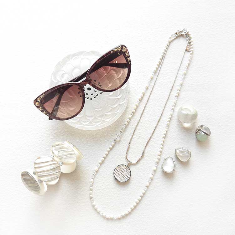 異素材のアイテムの組み合わせは、カラーや素材につながりを持たせることでまとまりが出ます。今回のアクセサリーはカラー(シルバー・ホワイト)、素材(パール・MOP)でリンク。