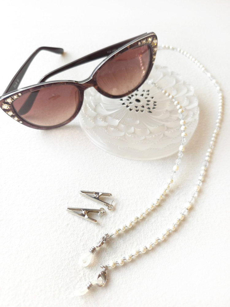 重ね付けしたパールネックレスは、実はグラスコード。サングラスをサッと付け外しできるのでとても便利です。クリップも付属しているので、帽子をかぶる時にはハットチェーンとしても使える優れもの。