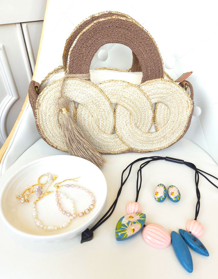 南国の花を描いたリゾーティーなデザインのメインアイテムに、淡くパープルがかった淡水パールのブレスレットやリングをレイヤードし、天然素材のバッグを合わせました。