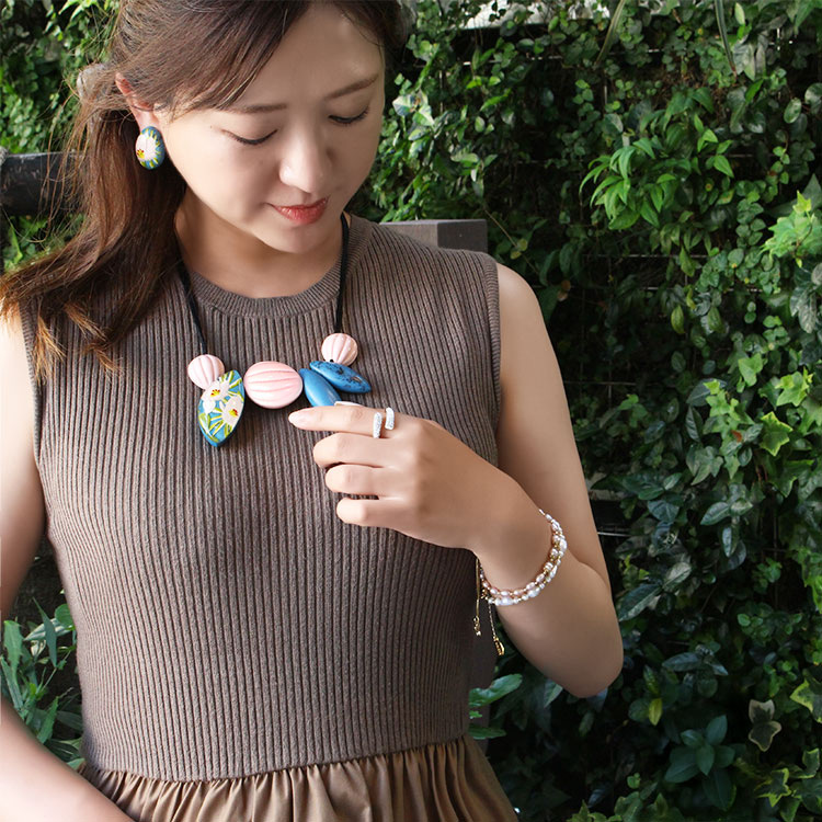夏といえば、はっきりと鮮やかなカラーのファッションアイテムが多いイメージですが、今回は柔らかな配色が印象的なシスカの夏モチーフアイテム“ALOHA”コレクションのネックレス&イヤリングをメインアイテムにセレクトしました。