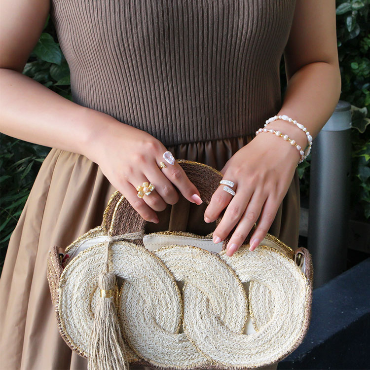 ナチュラルな風合いやパールの質感が水辺のリゾートを想起させつつ、肩肘張らない、程よいきちんと感も演出してくれます。