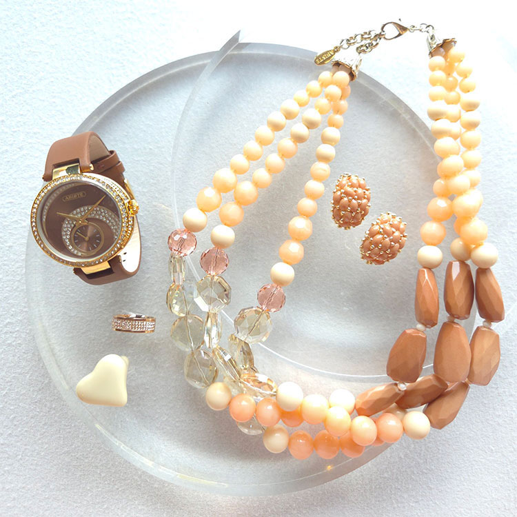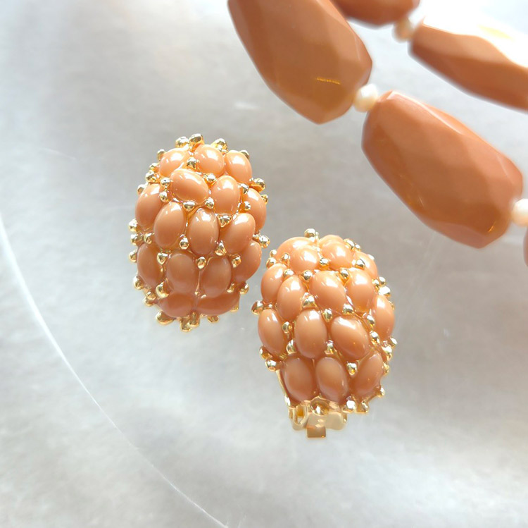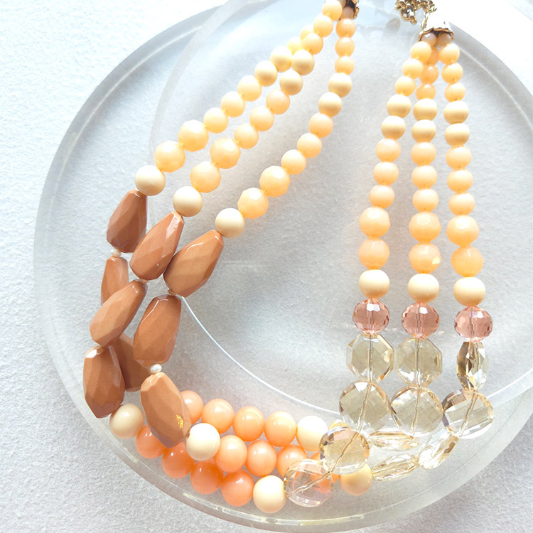 ピンクベージュを基調にした大ぶりなネックレスをメインアイテムに、同系色のイヤリングをオン。なじみカラーとしてほんのり血色感をプラスしてくれる色なのに、ピンクより甘さは控えめ。このバランスが大人の女性にぴったりです。