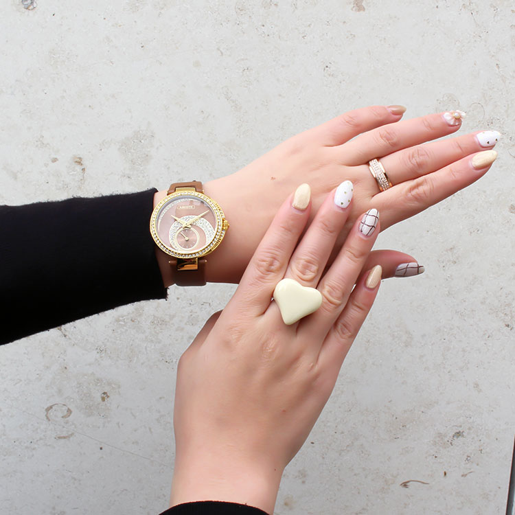 手元は甘くとろける、なめらかなミルクチョコレートのようなブラウンの腕時計や、チョコレートのようなつるんとしたハートシェイプのリングでバレンタインムードもプラス。