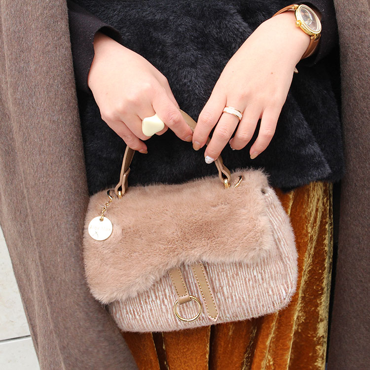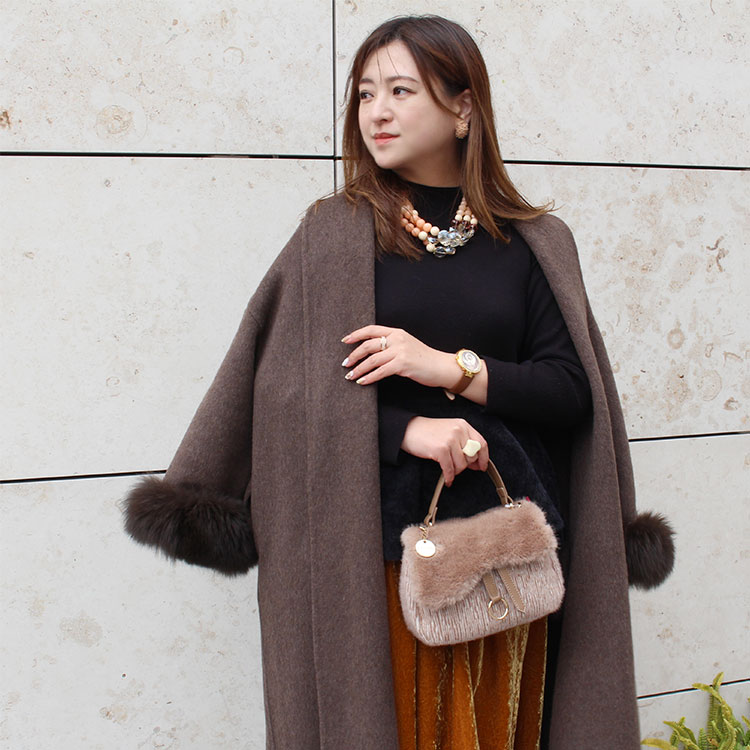 バッグは温かみのあるトーンのブラウンで合わせました。視覚・体感ともに暖かさを与えてくれるファーアイテムは、この時期には欠かせないアイテム。ふわふわの手触りには癒し効果も。