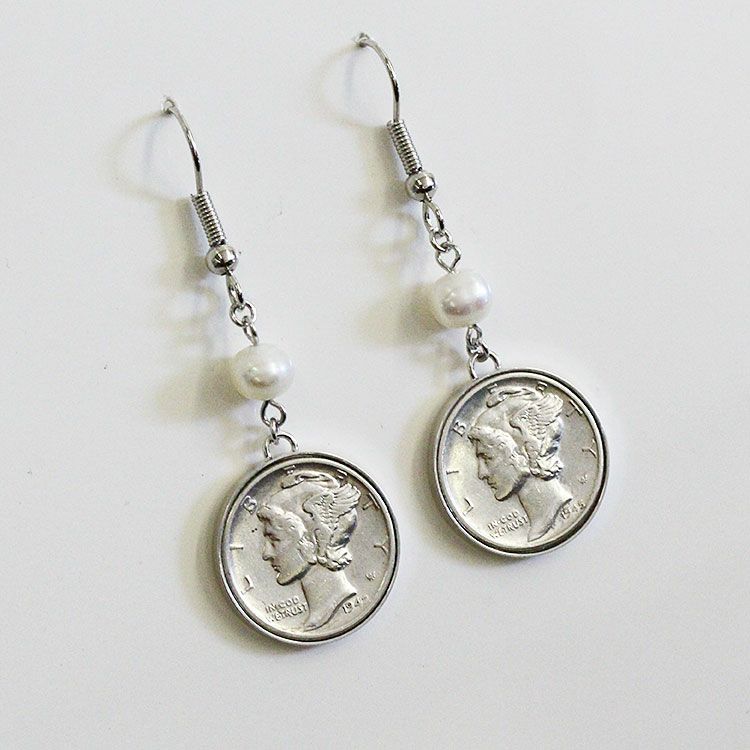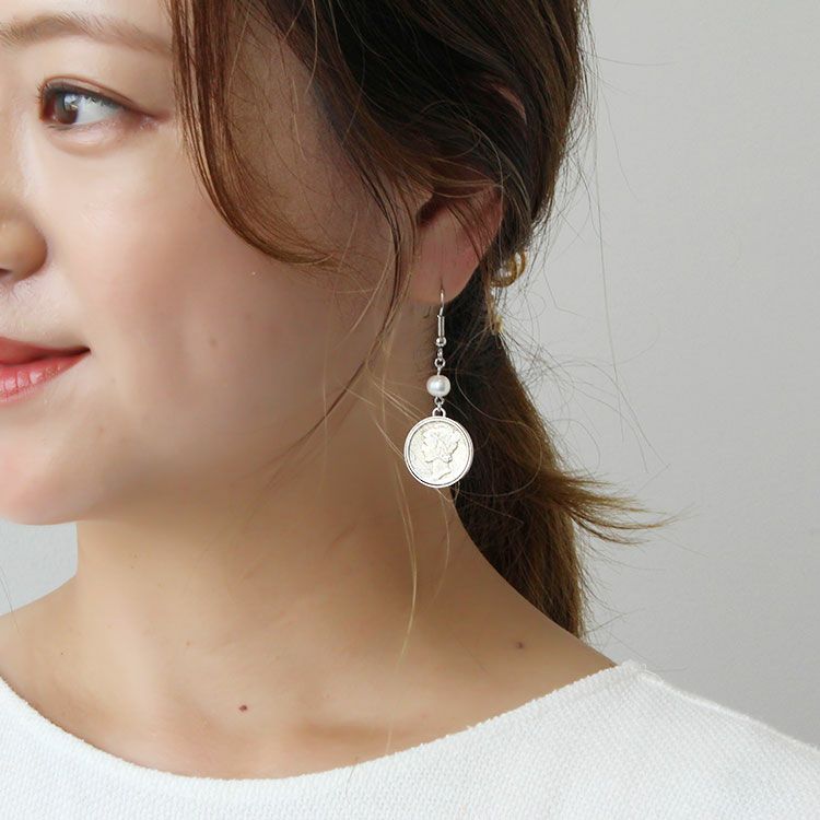 アメリカ10セントマーキュリーダイムコイン×パールロングイヤリング