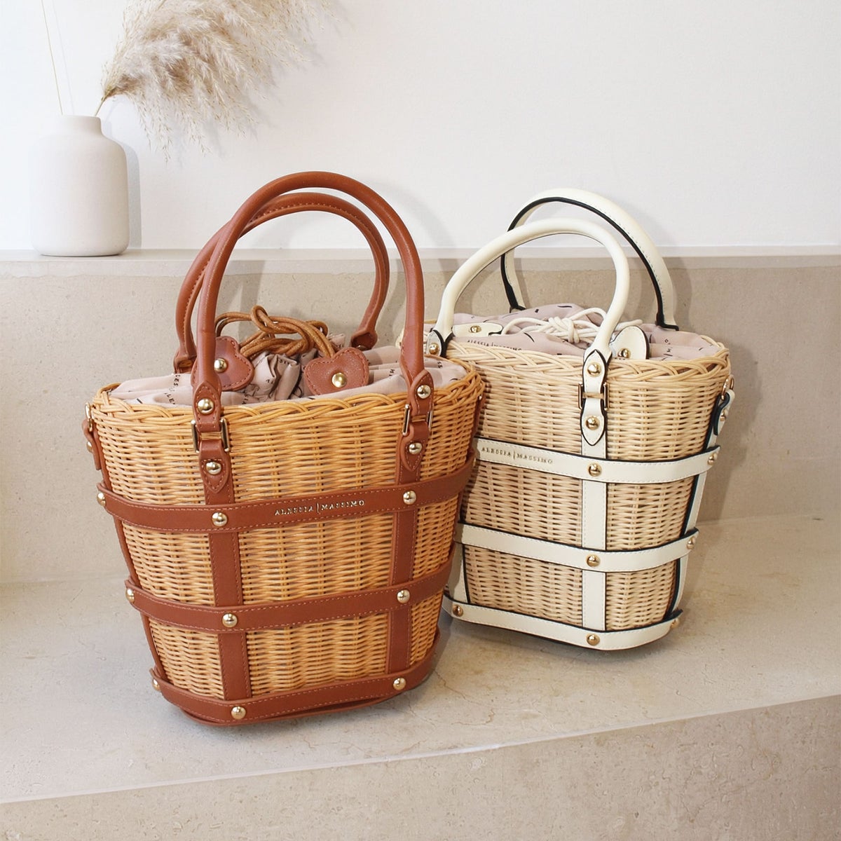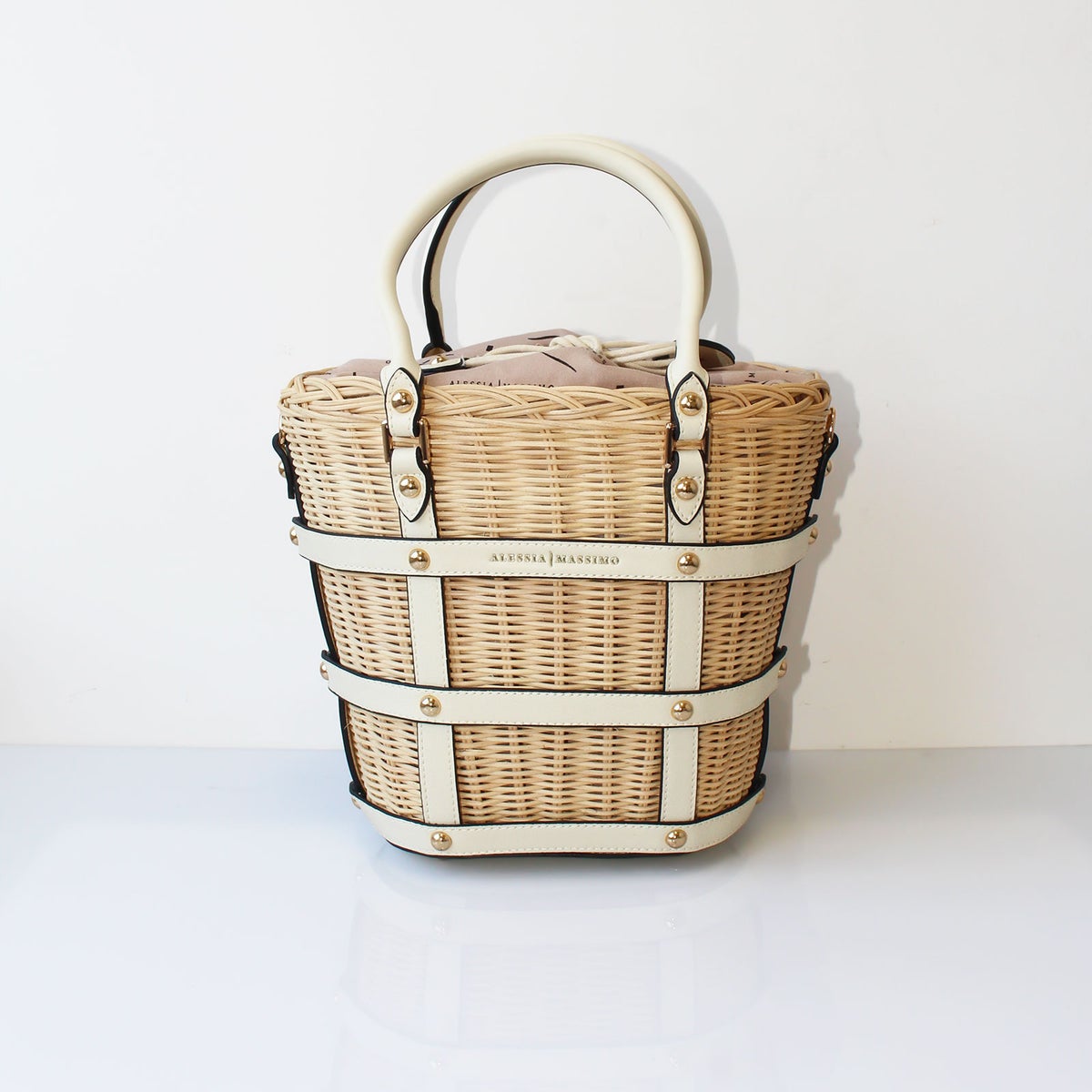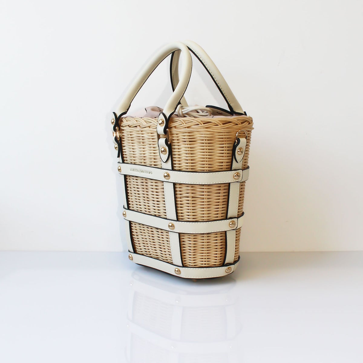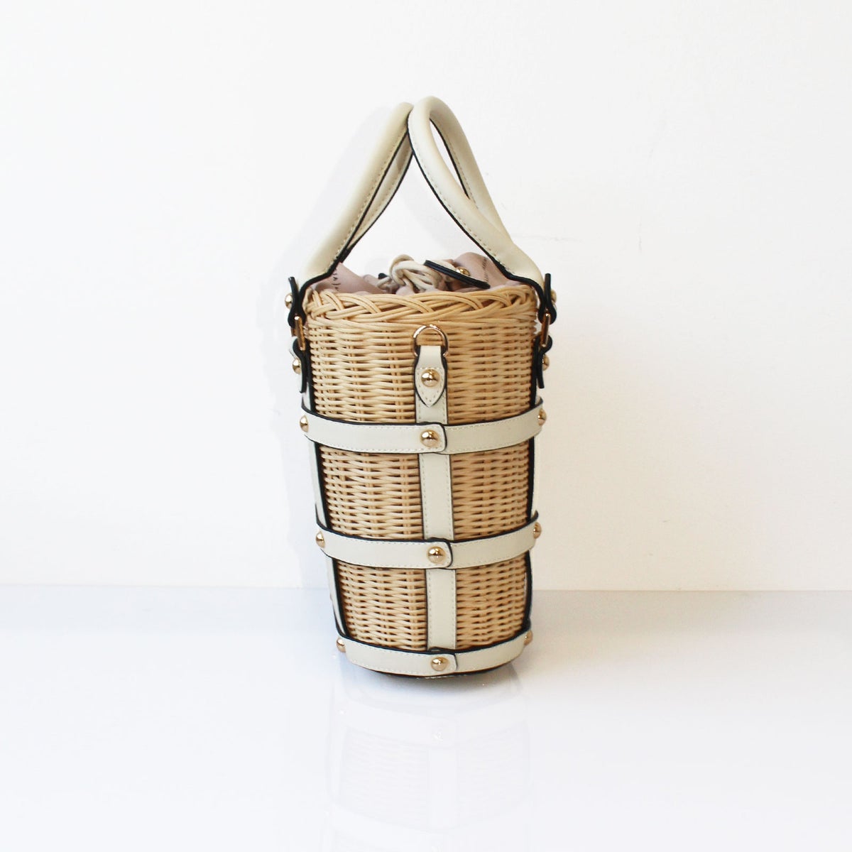 ストロー×PUレザーバケットシェイプ2wayかごバッグ