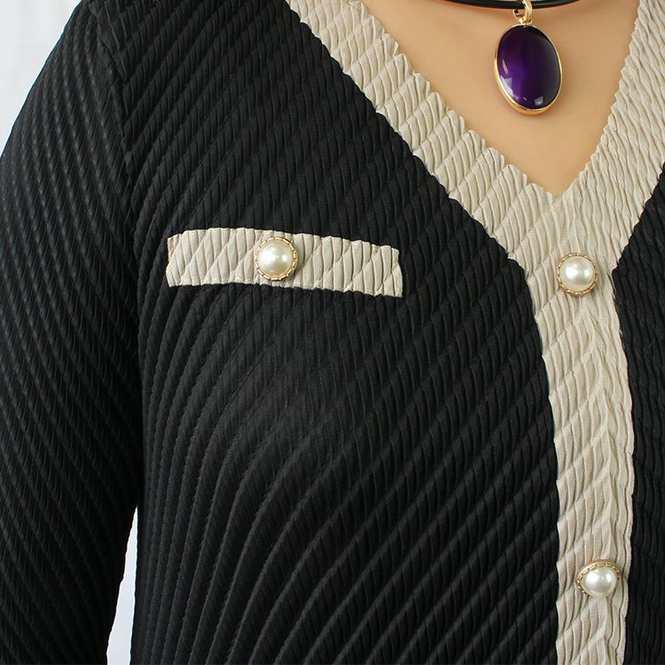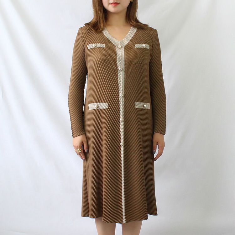 レース柄ドッキングデザイン八分袖プリーツワンピース