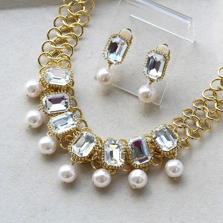 ビジュー×パールショートネックレス・イヤリングセット/1401061-2