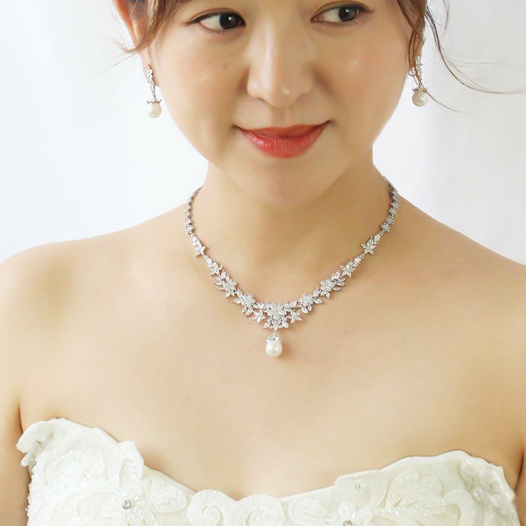 WEB先行販売 フラワーキュービックジルコニア×パールネックレス・イヤリングセット