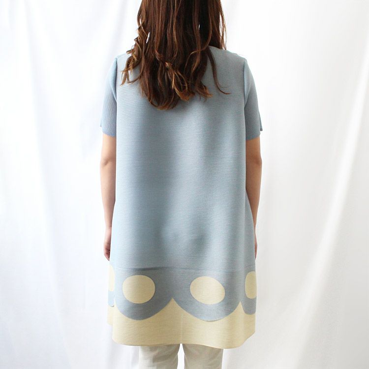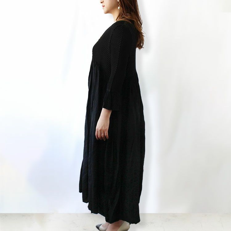 レース柄ドッキングデザイン八分袖プリーツワンピース